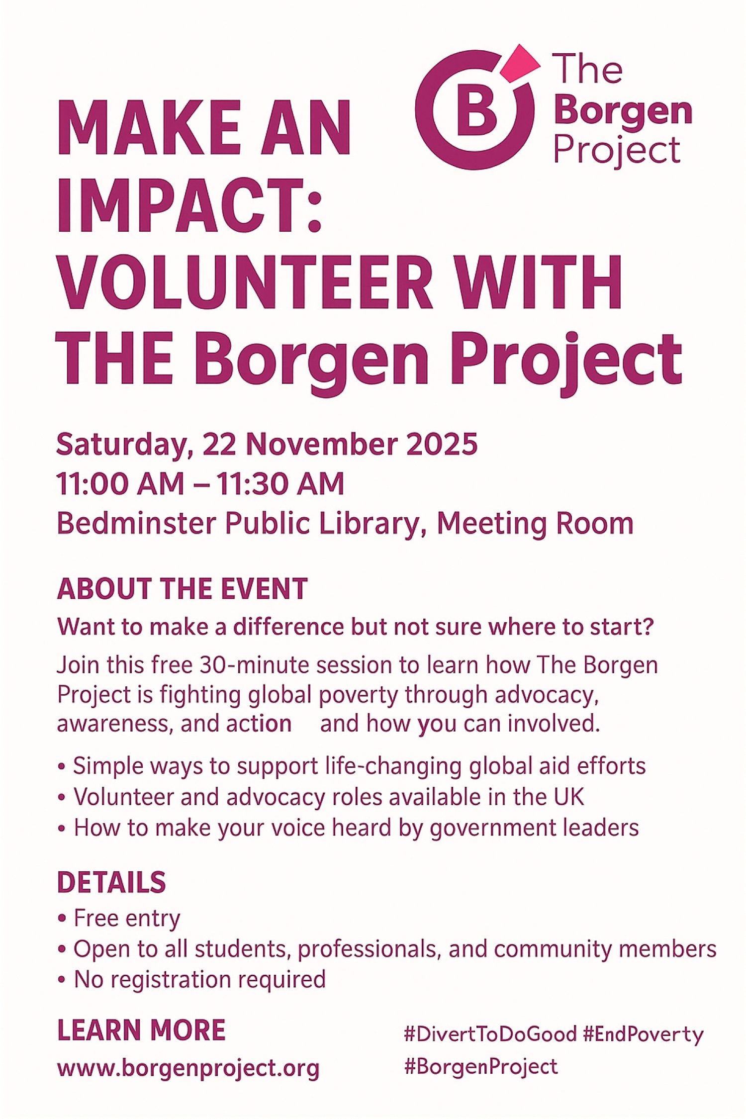 Das Event dauert 30 Minuten und bietet eine informative Einführung in die Mission des Borgen Project und die Möglichkeiten, sich zu engagieren.